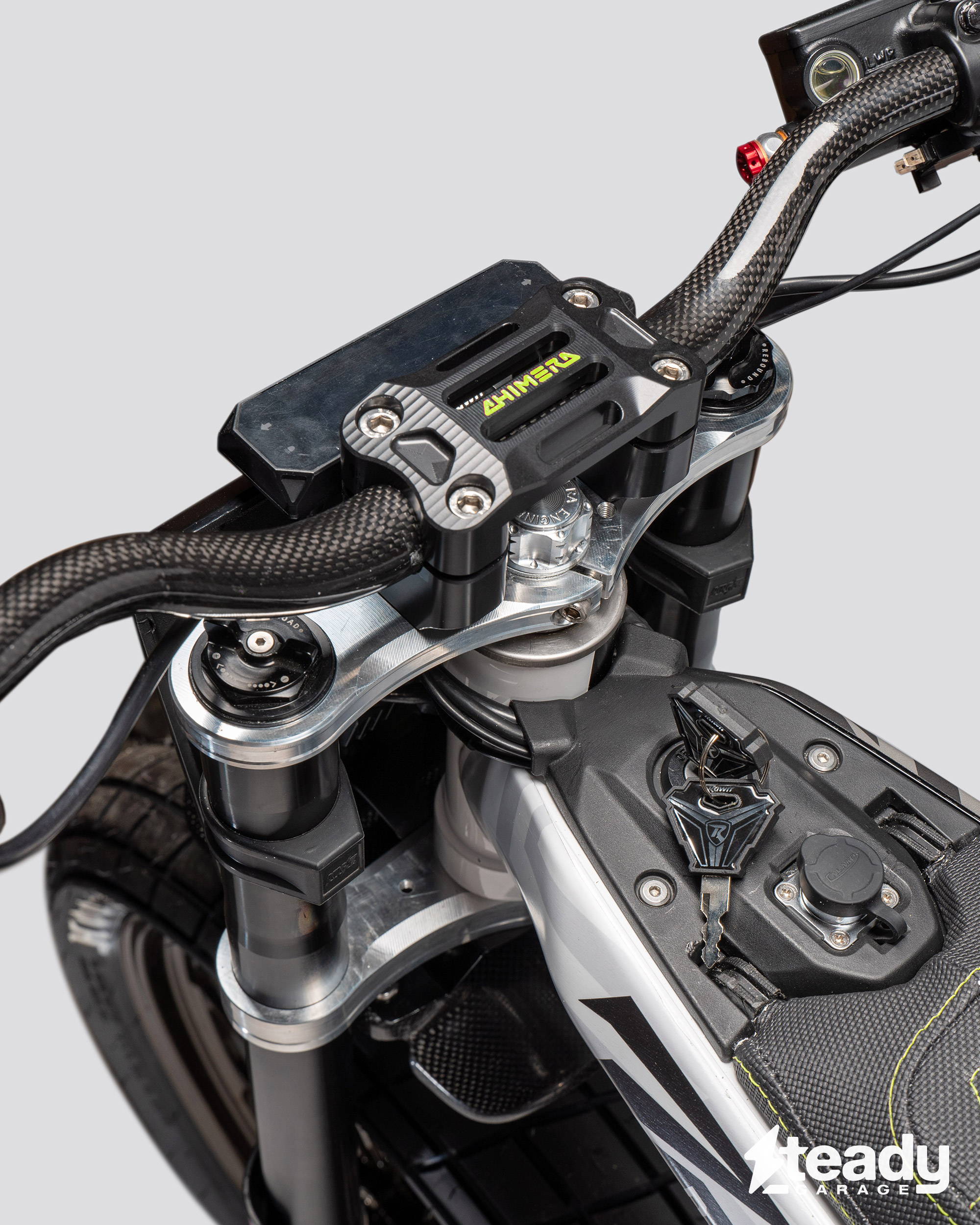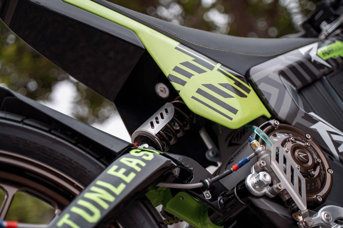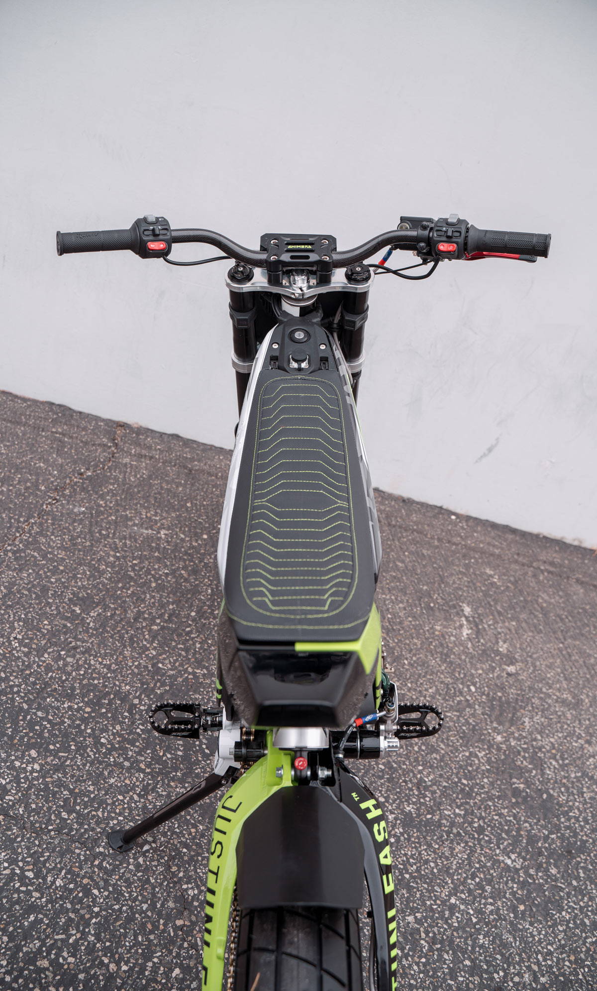 For the seat, we teamed up with Rogelio’s Auto Upholstery to completely rework the design so it flowed seamlessly with the new tail section. The tilt-up function was preserved for quick battery swaps, while grippy vinyl and a custom stitch pattern mirrored the bike’s sharp lines and side profile.