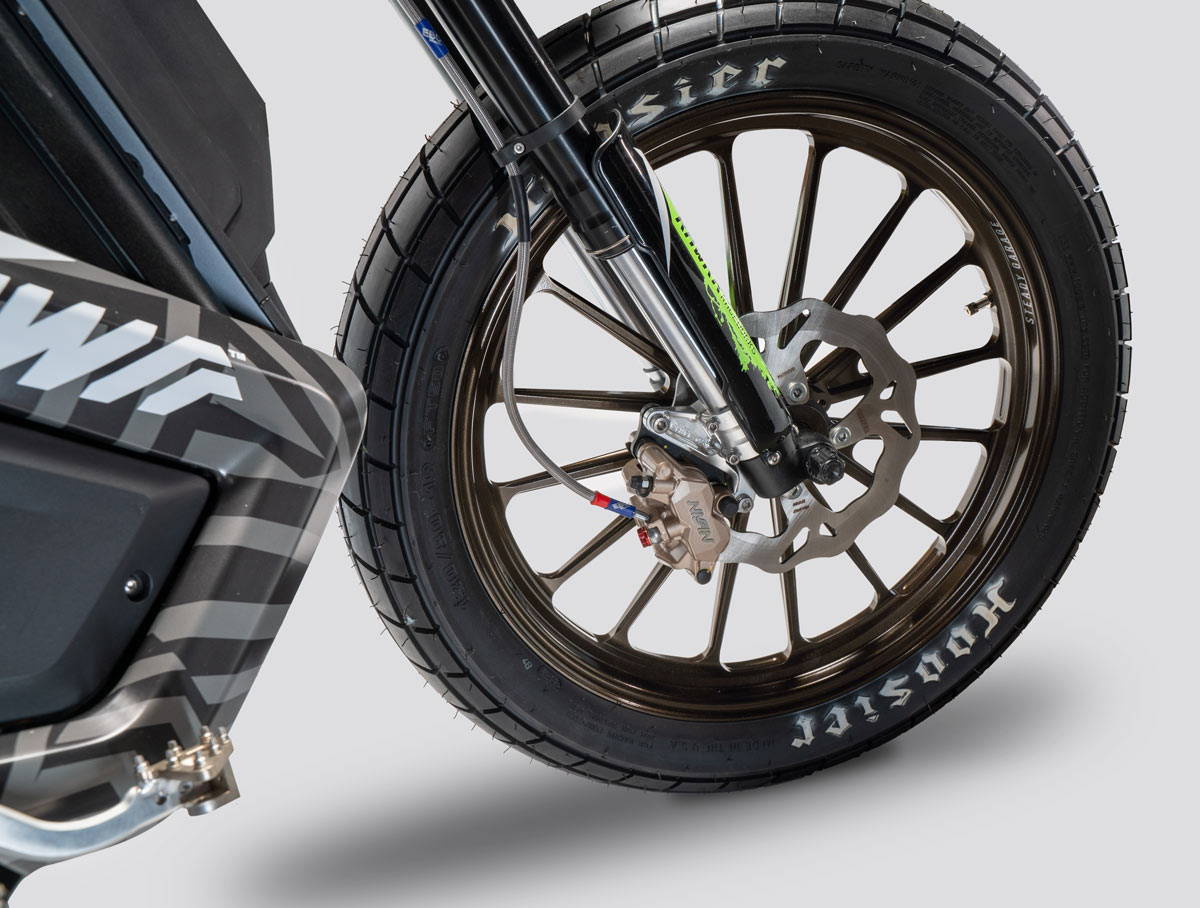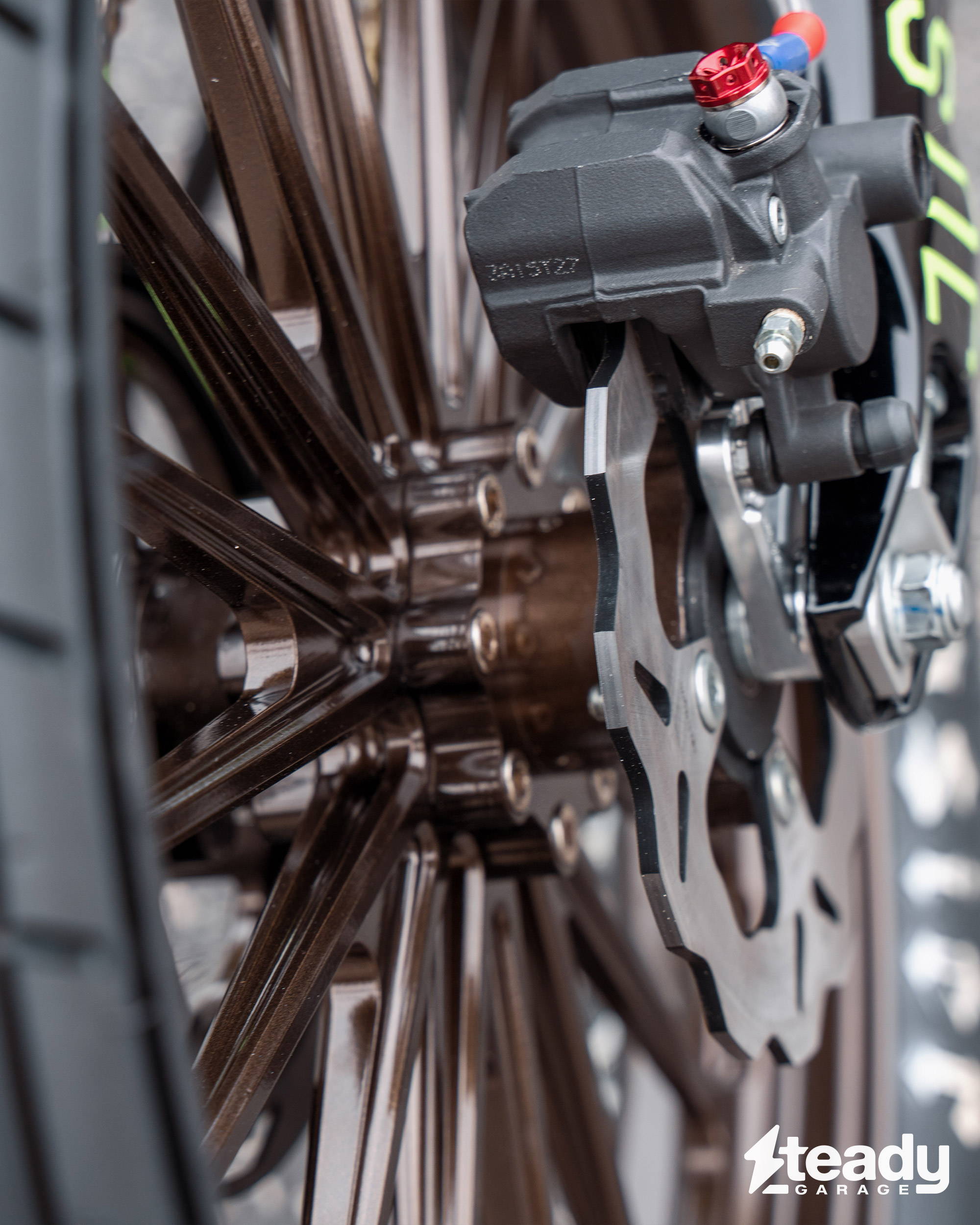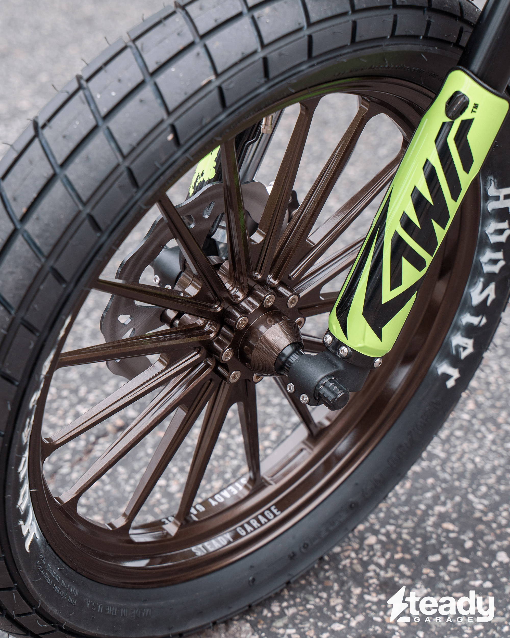 For performance and style, RSD supplied 19" forged flat track wheels. Chimera helped design and machine custom hubs, allowing the wheels to mount seamlessly to the Mantis. We also upgraded to motorcycle-spec brakes to handle the larger setup and used the chance to create a custom foot brake kit. To lock in the flat track vibe, we finished the package with Hoosier Moto Flat Track tires.