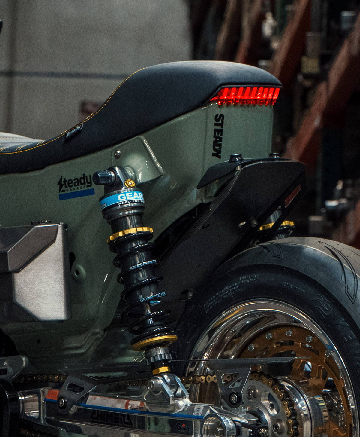 Up front, we’re running Gears Racing’s FFC-200TT full fork cartridges technology you’d typically see on race bikes. They feature complete adjustability for compression, rebound, and spring preload, all ingeniously engineered into compact 31mm I.D. stanchions. Out back, the Extra-Volume (EV) rear shocks provide tunable rebound, spring preload, and ride height adjustment, giving us the perfect balance of style, comfort, and performance.