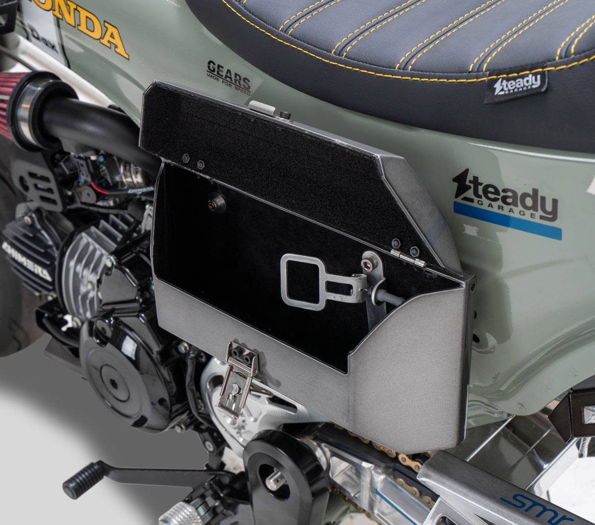 We custom built a storage box that house the seat release latch and allows for small items to be stowed in there, such as a small tool bag, spark plugs, and pocket items.