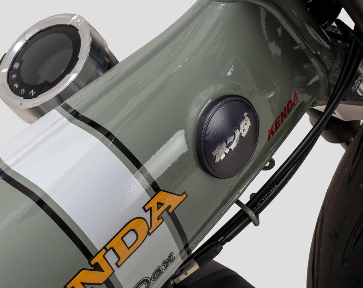 The original Dax came equipped with classic 3-piece wheels, made up of two rim hoops and a center section. For our build, we wanted to honor that heritage by keeping the iconic 4-spoke design, but with our own modern flare. We incorporated the styling into Chimera Engineering’s modular wheel centers and paired them with their rim hoops, sizing them to 12x5 in the rear and 12x4 up front. The 4-spoke layout not only nods to the original design but also ties in perfectly with the Dax’s namesake—the four short legs of a Dachshund. Wrapped with Kenda Kwik KD2 tires, which are practically street legal race slicks. Their minimal, clean tread pattern and rounded race profile complements the custom classic JDM aesthetic perfectly.