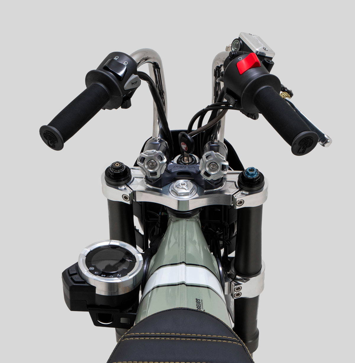 When it comes down to mini-moto styles, Japan started it all! The narrow positioned handlebar looks funky, but feels good. To keep it true to the classic style, we worked with Chimera Engineering to build a custom handlebar adapter that would allow us to mount custom stainless steel handlebars that brought back the original folding feature from the classic CT70's. But turning the knobs to remove the bolt, it would allow the handlebar to slip forward and fold downwards, making it easier to fit into low storage areas.